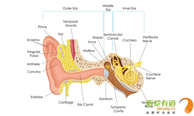 人的聽覺系統以耳蝸為中心,外在的聲音經外耳道傳入,震動鼓膜和聽小骨,再引起淋巴液、基底膜震動,刺激內耳螺旋器的毛細胞,產生聽覺,毛細胞把聲音信號轉為神經沖動,傳入聽神經至聽覺中樞完成聽覺。在整個聽覺過程中任何環節的病變均可以引起聽力障礙。