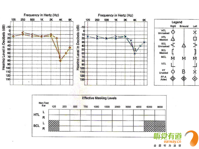 <span style="font-size:16px;"> 首先聽覺有道跟大家解釋一下純音測聽的定義以及臨床意義。純音測聽包括氣導聽閾測試(AC)和骨導聽閾測試(BC),以耳機及骨導振子給聲,反應受試者在安靜環境下能夠聽到的各個頻率的最小聲音的聽力級(氣導頻率范圍125-8000Hz,骨導250-4000Hz)。它是目前能準確反映聽敏度的主觀行為測試方法之一,在臨床上是最基本最重要的聽力檢查方法。</span></p><p><span style="font-size:16px;"><br /></span></p><p style="text-align: center;"><span style="font-size:16px;"><img src="/upfiles/201803010200415958.jpg" align="middle" alt="" /><br /></span></p><p style="text-align: center;"><span style="font-size:16px;"><br /></span></p><p><span style="font-size:16px;"> 先整體看一下聽力圖,它的橫坐標是純音的頻率,縱坐標表示的是聽力級(單位為db HL),從上往下看數字是變大的。0表示聽力零級,簡單地說就是科研人員測了很多聽力正常男女的聽力,以他們能聽到的最小聲音作為聽力零級。所以如果你的聽力是正常的話,聽力圖上的閾值曲線應該在零附近浮動,如果你聽力超常,那就在0以上也就是為負值了。如果你聽力下降,那線就往下走,越往下就說明聽力損失得越多。從生活常識上理解,所謂聽閾聽閾,閾值越低表示你能聽到越小的聲音,聽力就越好,閾值越高,聽力越差。</span></p><p><span style="font-size:16px;"> 接著說一下聽力圖上的圈圈叉叉代表的意思。叉叉表示左耳的氣導聽閾,圈圈表示右耳氣導,開口向左的尖括號表示左耳骨導,開口向右的表示右耳骨導。旁邊的masked表示加掩蔽之后的聽力。</span></p><p><span style="font-size:16px;"> 為什么要加掩蔽呢?舉個例子:你右耳聽力比左耳好,當你左耳給聲強度很大,會出現你左耳其實沒聽見但右耳偷聽到了的情況,這時你就會反應,但是這時你的反應能代表左耳的聽閾嗎?肯定比你實際聽閾要好,所以測聽人員會在你右耳加噪聲,不讓你右耳偷聽左耳的聲音,這樣測出來的左耳聽力稱掩蔽之后的聽閾。左耳掩蔽之后的氣導用小正方形來表示。同理,右耳掩蔽用小三角形表示。骨導也需要掩蔽。左耳掩蔽后骨導用向左的方括號表示,右耳用向右的方括號表示。</span></p><p><span style="font-size:16px;"> 最后我們該如何分析聽力圖。簡單地說,氣導的傳聲路徑包括外中內耳以及神經部分,骨導只包括內耳和神經部分,因此出現骨氣導差則表明聽覺通路上有外中耳病變。考慮到各種誤差因素,一般認為骨氣導相差10db HL屬于正常范圍。根據骨氣導的關系可以將聽力損失分為傳導性聽力損失、感音神經性聽力損失以及混合性聽力損失。骨氣導差大于10,且骨導在正常范圍為傳導性聽損;骨氣導一致且都在正常范圍以外為感音神經性聽損;骨氣導差大于10,骨導在正常范圍之外為混合性聽損。</span></p><p><span style="font-size:16px;"> 當然,如果想進一步定位聽力診斷結果,還需要結合其他的一些測試如聲導抗、ABR、耳蝸電圖、耳聲發射、40Hz、影像學檢查等。</span></p><p><span style="font-size:16px;"> 更多詳情請登錄m.ziputi.cn。</span></p>" />