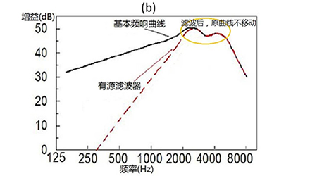 圖(a)中,當無源濾波器對低頻信息衰減過多時(衰減達12dB),會使原來的高頻增益曲線發生移動,進而影響音質和增益調節的準確性。