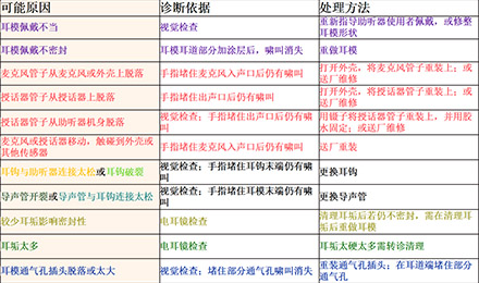 <span style="font-size:16px;"> 嘯叫,一直是引起助聽(tīng)器使用者不滿的一大原因,也是驗(yàn)配師在助聽(tīng)器調(diào)試時(shí)最為棘手的難題之一。</span></p><p><span style="font-size:16px;"> 通常,嘯叫分內(nèi)部嘯叫和外部嘯叫。內(nèi)部嘯叫常由內(nèi)部零件故障引起,而外部嘯叫則是與助聽(tīng)器外殼或耳模,助聽(tīng)器調(diào)試等有關(guān)。</span></p><p style="text-align: center;"><span style="font-size:16px;"><img src="/upfiles/201810100140556872.jpg" alt="" /><br /></span></p><p><span style="font-size:16px;"> 我們常常說(shuō)的外部嘯叫是在聲音被麥克風(fēng)拾取、放大器放大、授話器轉(zhuǎn)換后,又從各種縫隙(如外殼與耳道的縫隙、通氣孔)中“跑”出來(lái),又“跑”進(jìn)去,如此反復(fù)多次,使得聲音越來(lái)越大,產(chǎn)生“吱吱吱”的惱人嘯叫。</span></p><p><span style="font-size:16px;"> 以助聽(tīng)器的角度來(lái)看,shou話器把聲音授給耳朵聽(tīng),當(dāng)用“授”,即授話器。</span></p><p><span style="font-size:16px;"> 接下來(lái)將分別針對(duì)定制式(ITE/ITC/CIC)和耳背式(BTE)助聽(tīng)器的嘯叫問(wèn)題,跟著產(chǎn)生嘯叫的路徑,一一“攻破”嘯叫難題。注意,這里不說(shuō)助聽(tīng)器調(diào)試,只尋嘯叫路徑,并“堵死”嘯叫“通路”,讓進(jìn)入助聽(tīng)器的聲音“不走回頭路”。</span></p><p><span style="font-size:16px;"> 1、ITE/ITC/CIC助聽(tīng)器</span></p><p><span style="font-size:16px;"> 先來(lái)看看ITE/ITC/CIC助聽(tīng)器可能發(fā)生嘯叫的路徑。</span></p><p><span style="font-size:16px;"> 圖1里是一個(gè)定制式助聽(tīng)器佩戴于外耳道內(nèi)的示意圖,各種顏色的字和相應(yīng)顏色的標(biāo)記展示了發(fā)生嘯叫的各種情況。</span></p><center><span style="font-size:16px;"><img alt="" src="/upfiles/201810100142273990.png" width="440" height="250" /></span></center><p></p><p style="text-align: center;"><span style="font-size:16px;">圖1:ITE/ITC/CIC助聽(tīng)器發(fā)生嘯叫的路徑一覽</span></p><p style="text-align: left;"><span style="font-size:16px;"> 例如,紅色表示“麥克風(fēng)管子脫落”,這屬于助聽(tīng)器內(nèi)部零件脫落、故障,為內(nèi)部嘯叫。</span></p><p><span style="font-size:16px;"> 橙色表示“外殼佩戴太松”,這屬于外殼不密封的聲音泄露,為外部嘯叫。</span></p><p><span style="font-size:16px;"> 那如何檢查出是這些原因,并對(duì)問(wèn)題進(jìn)行相應(yīng)處理呢?請(qǐng)對(duì)照表1中的“診斷依據(jù)”和“處理方法”查看。</span></p><center><span style="font-size:16px;"><img alt="" src="/upfiles/201810100142337254.png" width="520" height="250" /></span></center><p></p><p style="text-align: center;"><span style="font-size:16px;">表1:ITE/ITC/CIC助聽(tīng)器產(chǎn)生嘯叫的可能原因及對(duì)應(yīng)的診斷依據(jù)、處理方法</span></p><p><span style="font-size:16px;"> 例如,當(dāng)發(fā)現(xiàn)“手指堵住麥克風(fēng)入聲口后仍有嘯叫”,可推斷原因是“麥克風(fēng)管子從麥克風(fēng)或外殼上脫落”或“麥克風(fēng)或授話器移動(dòng),觸碰到外殼或其他傳感器”,這時(shí)的處理方法是“送廠維修”。</span></p><p><span style="font-size:16px;"> 2、BTE助聽(tīng)器</span></p><p><span style="font-size:16px;"> 學(xué)會(huì)了看ITE/ITC/CIC助聽(tīng)器的一圖一表,再來(lái)看看BTE助聽(tīng)器的嘯叫路徑圖(圖2),以及表2中羅列的可能原因、診斷依據(jù)和處理方法,相信看起來(lái)更加輕松、直觀、一目了然。</span></p><center><span style="font-size:16px;"><img alt="" src="/upfiles/201810100142383483.png" width="440" height="250" /></span></center><p></p><p style="text-align: center;"><span style="font-size:16px;">圖2:BTE助聽(tīng)器發(fā)生嘯叫的路徑一覽</span></p><center><span style="font-size:16px;"><img alt="" src="/upfiles/201810100142449945.png" width="462" height="273" /></span></center><p></p><p style="text-align: center;"><span style="font-size:16px;">表2:BTE助聽(tīng)器產(chǎn)生嘯叫的可能原因及對(duì)應(yīng)的診斷依據(jù)、處理方法</span></p><p><span style="font-size:16px;"> 更多詳情請(qǐng)登錄m.ziputi.cn。</span></p>" />