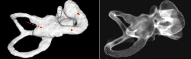 先天性內(nèi)耳畸形的疾病種類繁多,診斷比較困難,隨著高分辨CT和磁共振(MRI)的應(yīng)用,目前診斷率不斷提高。臨床常見(jiàn)的內(nèi)耳畸形包括大前庭導(dǎo)水管綜合癥、先天性耳蝸畸形、米歇爾聽(tīng)障及沙伊貝聽(tīng)障。本篇將后三種畸形介紹如下:</p><p> 先天性耳蝸畸形(Congenital cochlear malformation)</p><p> 先天性耳蝸畸形又稱Mondini內(nèi)耳發(fā)育不全,是最常見(jiàn)的一種內(nèi)耳畸形。</p><p> 1、病因</p><p> 本病可為常染色體顯性或隱性遺傳病,也可為非遺傳性因素,如風(fēng)疹病毒感染、過(guò)多的放射線暴露以及反應(yīng)停類藥物等引起。</p><p> 2、臨床表現(xiàn)</p><p> 先天性耳蝸畸形包括耳蝸扁平、耳蝸發(fā)育不良,特別是第二圈和頂圈發(fā)育不良,兩者合并為一個(gè)腔;前庭擴(kuò)大,巨大的前庭導(dǎo)水管以及半規(guī)管畸形、內(nèi)耳道擴(kuò)大等癥。在具體病例中不一定以上所有的畸形同時(shí)出現(xiàn),可僅出現(xiàn)其中一種或幾種畸形。</p><p> 3、聽(tīng)力學(xué)表現(xiàn)</p><p> 出生即無(wú)聽(tīng)力,或1~2歲時(shí)才出現(xiàn)聽(tīng)力減退,主要為感音神經(jīng)性聽(tīng)障,部分可為混合性聽(tīng)障,有部分患者可長(zhǎng)期保存殘余聽(tīng)力。個(gè)別患者可有眩暈發(fā)作。</p><p> 4、診斷</p><p> 主要根據(jù)聽(tīng)力學(xué)表現(xiàn)和影像學(xué)檢查。通過(guò)高分辨CT可看到耳蝸畸形。內(nèi)耳MRI顯示膜迷路內(nèi)水充盈,耳蝸扁平,耳蝸第二圈與頂圈間隔缺損,以及半規(guī)管、前庭的畸形。</p><p> </p><center><img alt="" src="/upfiles/201903250158493159.png" width="640" height="200" /></center><p></p><p> 先天性耳蝸畸形伴前庭和外半規(guī)管發(fā)育不良</p><p> 5、治療</p><p> 目前尚無(wú)有效的治療方法。如有殘余聽(tīng)力,可佩帶助聽(tīng)器后進(jìn)行語(yǔ)言康復(fù)。無(wú)殘余聽(tīng)力或極重度聽(tīng)障患者可考慮人工耳蝸植入。</p><p> 米歇爾聽(tīng)障(Michel’s deafness)</p><p> 屬常染色體顯性遺傳,是最嚴(yán)重的內(nèi)耳畸形,內(nèi)耳可完全未發(fā)育,可伴有其它器官的畸形和智力障礙。</p><p> 1、診斷</p><p> 主要依靠顳骨高分辨CT和內(nèi)耳MRI。</p><p> </p><center><img alt="" src="/upfiles/201903250158577271.png" width="640" height="160" /></center><p></p><p> 雙側(cè)內(nèi)耳畸形:左側(cè)無(wú)內(nèi)耳迷路及內(nèi)耳道機(jī)構(gòu),為米歇爾畸形;右側(cè)空耳蝸及前庭擴(kuò)大,為先天性耳蝸畸形</p><p> 2、治療</p><p> 目前無(wú)特殊辦法,此類病例不適合行人工耳蝸植入術(shù),但是聽(tīng)覺(jué)腦干植入術(shù)的適應(yīng)癥,其效果有待進(jìn)一步證實(shí)。</p><p> 沙伊貝聽(tīng)障(Scheibe dysplasia)</p><p> 為常染色體隱性遺傳,是最輕的內(nèi)耳畸形,畸形僅限于蝸管和球囊,故又稱耳蝸球囊型畸形。</p><p> 1、診斷</p><p> 主要根據(jù)先天性聽(tīng)損和MRI檢查</p><p> 2、治療</p><p> 此病可選擇性地行人工耳蝸植入術(shù)。</p><p> 更多詳情請(qǐng)登錄聽(tīng)覺(jué)有道助聽(tīng)器m.ziputi.cn</p>" />