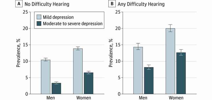 左邊為沒有聽力損失的抑郁概率,右邊為有聽力損失的抑郁概率。統(tǒng)計來源:《美國醫(yī)學(xué)雜志》