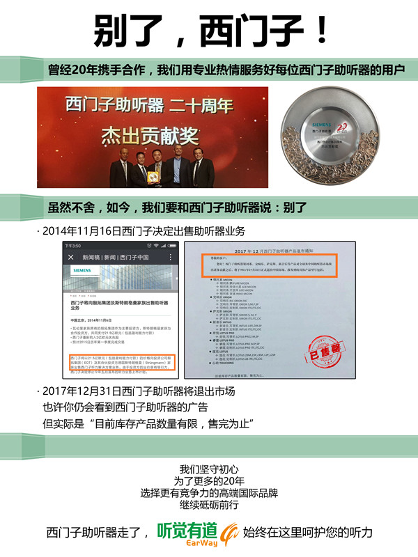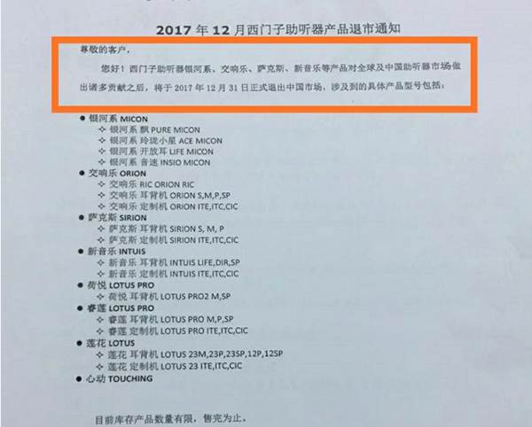 <p microsoft="" yahei="" ui="" simsun="" segoe="" tahoma="" helvetica="" sans-serif="" font-size:="" 14px="" text-align:="" center="" style="padding: 5px 0px; margin: 0px; color: rgb(51, 51, 51); font-family: "Microsoft YaHei UI", "Microsoft YaHei", SimSun, "Segoe UI", Tahoma, Helvetica, sans-serif; font-size: 16px; text-align: center;"><img src="http://m.ziputi.cn/upfiles/201712110502357735.jpg" alt="" style="border: 0px;" /></p><p microsoft="" yahei="" ui="" simsun="" segoe="" tahoma="" helvetica="" sans-serif="" font-size:="" 14px="" text-align:="" center="" style="padding: 5px 0px; margin: 0px; color: rgb(51, 51, 51); font-family: "Microsoft YaHei UI", "Microsoft YaHei", SimSun, "Segoe UI", Tahoma, Helvetica, sans-serif; font-size: 16px; text-align: center;"><br /></p><p microsoft="" yahei="" ui="" simsun="" segoe="" tahoma="" helvetica="" sans-serif="" font-size:="" 14px="" text-align:="" center="" style="padding: 5px 0px; margin: 0px; color: rgb(51, 51, 51); font-family: "Microsoft YaHei UI", "Microsoft YaHei", SimSun, "Segoe UI", Tahoma, Helvetica, sans-serif; font-size: 16px; text-align: center;"><img src="http://m.ziputi.cn/upfiles/201712201117438957.jpg" alt="" style="border: 0px;" /><br /></p><p microsoft="" yahei="" ui="" simsun="" segoe="" tahoma="" helvetica="" sans-serif="" font-size:="" 14px="" text-align:="" center="" style="padding: 5px 0px; margin: 0px; color: rgb(51, 51, 51); font-family: "Microsoft YaHei UI", "Microsoft YaHei", SimSun, "Segoe UI", Tahoma, Helvetica, sans-serif; font-size: 16px; text-align: center;"><br /></p><p microsoft="" yahei="" ui="" simsun="" segoe="" tahoma="" helvetica="" sans-serif="" font-size:="" 14px="" text-align:="" center="" style="padding: 5px 0px; margin: 0px; color: rgb(51, 51, 51); font-family: "Microsoft YaHei UI", "Microsoft YaHei", SimSun, "Segoe UI", Tahoma, Helvetica, sans-serif; font-size: 16px; text-align: center;">2014年11月16日西門子決定出售助聽器業務</p><p microsoft="" yahei="" ui="" simsun="" segoe="" tahoma="" helvetica="" sans-serif="" font-size:="" 14px="" text-align:="" center="" style="padding: 5px 0px; margin: 0px; color: rgb(51, 51, 51); font-family: "Microsoft YaHei UI", "Microsoft YaHei", SimSun, "Segoe UI", Tahoma, Helvetica, sans-serif; font-size: 16px; text-align: center;"> </p><center microsoft="" yahei="" ui="" simsun="" segoe="" tahoma="" helvetica="" sans-serif="" font-size:="" 14px="" style="color: rgb(51, 51, 51); font-family: "Microsoft YaHei UI", "Microsoft YaHei", SimSun, "Segoe UI", Tahoma, Helvetica, sans-serif; font-size: 16px;"><img src="http://m.ziputi.cn/upfiles/20171211050740709.jpg" alt="" style="border: 0px;" /><br /></center><center microsoft="" yahei="" ui="" simsun="" segoe="" tahoma="" helvetica="" sans-serif="" font-size:="" 14px="" style="color: rgb(51, 51, 51); font-family: "Microsoft YaHei UI", "Microsoft YaHei", SimSun, "Segoe UI", Tahoma, Helvetica, sans-serif; font-size: 16px;"><br /></center><p microsoft="" yahei="" ui="" simsun="" segoe="" tahoma="" helvetica="" sans-serif="" font-size:="" 14px="" text-align:="" center="" style="padding: 5px 0px; margin: 0px; color: rgb(51, 51, 51); font-family: "Microsoft YaHei UI", "Microsoft YaHei", SimSun, "Segoe UI", Tahoma, Helvetica, sans-serif; font-size: 16px; text-align: center;">2017年12月31日西門子助聽器將正式退出中國市場</p><p microsoft="" yahei="" ui="" simsun="" segoe="" tahoma="" helvetica="" sans-serif="" font-size:="" 14px="" text-align:="" center="" style="padding: 5px 0px; margin: 0px; color: rgb(51, 51, 51); font-family: "Microsoft YaHei UI", "Microsoft YaHei", SimSun, "Segoe UI", Tahoma, Helvetica, sans-serif; font-size: 16px; text-align: center;"> </p><center microsoft="" yahei="" ui="" simsun="" segoe="" tahoma="" helvetica="" sans-serif="" font-size:="" 14px="" style="color: rgb(51, 51, 51); font-family: "Microsoft YaHei UI", "Microsoft YaHei", SimSun, "Segoe UI", Tahoma, Helvetica, sans-serif; font-size: 16px;"><img src="http://m.ziputi.cn/upfiles/201712110508305244.png" alt="" style="border: 0px;" /><br /></center><center microsoft="" yahei="" ui="" simsun="" segoe="" tahoma="" helvetica="" sans-serif="" font-size:="" 14px="" style="color: rgb(51, 51, 51); font-family: "Microsoft YaHei UI", "Microsoft YaHei", SimSun, "Segoe UI", Tahoma, Helvetica, sans-serif; font-size: 16px;"><br /></center><p microsoft="" yahei="" ui="" simsun="" segoe="" tahoma="" helvetica="" sans-serif="" font-size:="" 14px="" text-align:="" center="" style="padding: 5px 0px; margin: 0px; color: rgb(51, 51, 51); font-family: "Microsoft YaHei UI", "Microsoft YaHei", SimSun, "Segoe UI", Tahoma, Helvetica, sans-serif; font-size: 16px; text-align: center;">銀河系、交響樂、薩克斯、新音樂、荷悅、睿蓮、蓮花、心動……</p><p microsoft="" yahei="" ui="" simsun="" segoe="" tahoma="" helvetica="" sans-serif="" font-size:="" 14px="" text-align:="" center="" style="padding: 5px 0px; margin: 0px; color: rgb(51, 51, 51); font-family: "Microsoft YaHei UI", "Microsoft YaHei", SimSun, "Segoe UI", Tahoma, Helvetica, sans-serif; font-size: 16px; text-align: center;">西門子助聽器系列產品悉數退市</p><p microsoft="" yahei="" ui="" simsun="" segoe="" tahoma="" helvetica="" sans-serif="" font-size:="" 14px="" text-align:="" center="" style="padding: 5px 0px; margin: 0px; color: rgb(51, 51, 51); font-family: "Microsoft YaHei UI", "Microsoft YaHei", SimSun, "Segoe UI", Tahoma, Helvetica, sans-serif; font-size: 16px; text-align: center;"> </p><center microsoft="" yahei="" ui="" simsun="" segoe="" tahoma="" helvetica="" sans-serif="" font-size:="" 14px="" style="color: rgb(51, 51, 51); font-family: "Microsoft YaHei UI", "Microsoft YaHei", SimSun, "Segoe UI", Tahoma, Helvetica, sans-serif; font-size: 16px;"><img src="http://m.ziputi.cn/upfiles/201712110509096639.jpg" alt="" style="border: 0px;" /><br /></center><p microsoft="" yahei="" ui="" simsun="" segoe="" tahoma="" helvetica="" sans-serif="" font-s