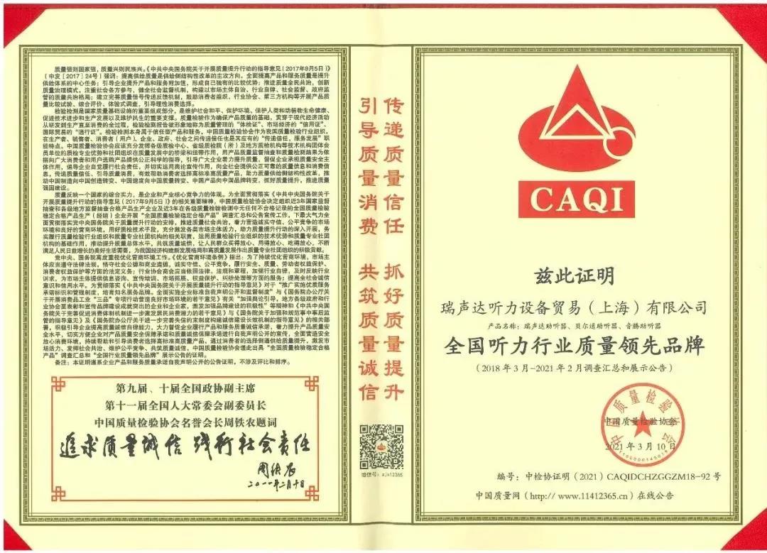 這三項榮譽包括“全國產品和服務質量誠信示范企業”“全國聽力行業質量領先品牌”“全國質量檢驗穩定合格產品”。