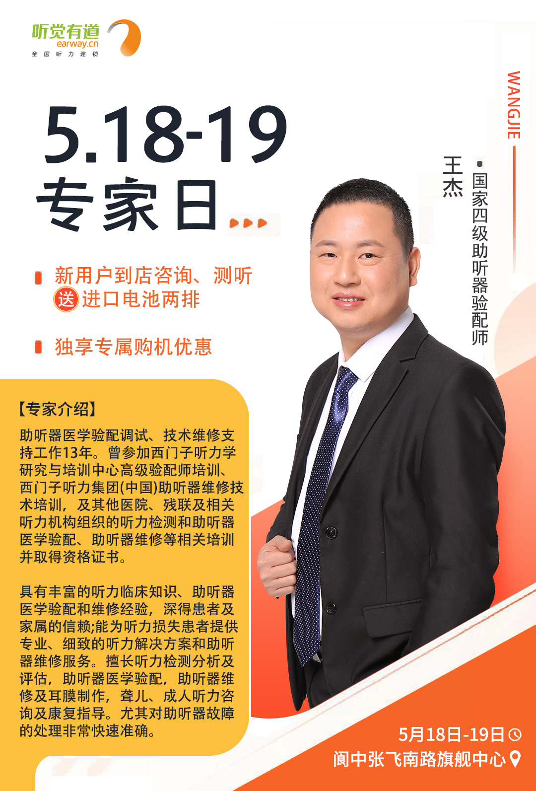 <span style="white-space:pre"> </span>為了更好地服務聽損人士,帶來高質量的聆聽感受,聽覺有道全國聽力連鎖將持續開展專家入店活動。<br /></span><p><span style="font-size:16px;"> 專家日現場,聽覺有道金牌聽力專家將為您解答聽力相關問題,調試和驗配助聽器,讓您能夠更好地聆聽這個世界的美好。</span></p><p style="text-align: center;"><img src="/upfiles/202104300114022603.jpg" width="640" alt="" /><br /></p><p style="text-align: center;"><br /></p><span style="font-size:16px;"> <strong>活動預告<br /><br /> 聽覺有道專家入店行程表</strong><br /><br /> 聽覺有道東莞塘廈驗配中心<br /> 時間:5月2日<br /> 專家:李冬根<br /> 電話:0769-87927386<br /> 手機:18923091281<br /> 地址:廣東省東莞市塘廈鎮塘廈大道中70-108號(水電三局對面)<br /><br /> 聽覺有道達州開江驗配中心<br /> 時間:5月6日~7日<br /> 專家:羅夢薇<br /> 電話:0818-8222079<br /> 手機:19182813889<br /> 地址:四川省達州市開江縣新寧鎮龍池街77號(開江縣人民醫院正門對面)<br /><br /> 聽覺有道成都邛崍驗配中心<br /> 時間:5月6日~7日<br /> 專家:王蕾<br /> 電話:028-88734181<br /> 手機:18908177682<br /> 地址:四川省邛崍市鳳凰大道484號高宇南庭(醫療中心醫院對面)<br /><br /></span><span style="white-space:pre"><span style="font-size:16px;"> 聽覺有道閬中張飛南路旗艦中心<br /> 時間:5月18日~19日<br /> 專家:王杰<br /> 電話:0817-6250177<br /> 手機:17398130629<br /></span></span><p><span style="white-space:pre"><span style="font-size:16px;"> 地址:四川省閬中市張飛南路126號(人民醫院正對面)</span></span></p><p style="text-align: center;"><img src="/upfiles/202104300134599048.jpg" width="640" alt="" /> <img src="/upfiles/202104300134592952.jpg" width="640" alt="" /> <img src="/upfiles/202104300134592080.jpg" width="640" alt="" /><br /></p><p style="text-align: center;"><img src="/upfiles/202104300135382254.jpg" width="640" alt="" /><br /></p><p style="text-align: center;"><br /></p>" />