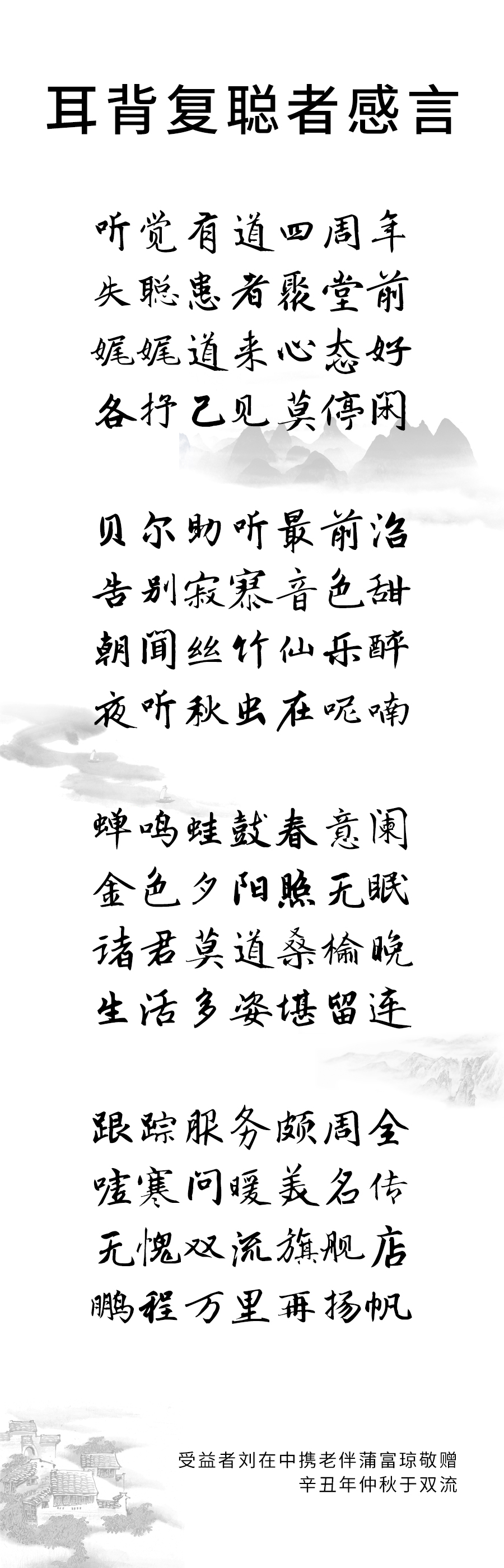辛丑年仲秋,聽覺有道雙流旗艦店四周年慶將至,劉在中老先生有感而發,作詩一首,以表對驗配師服務工作的認可。